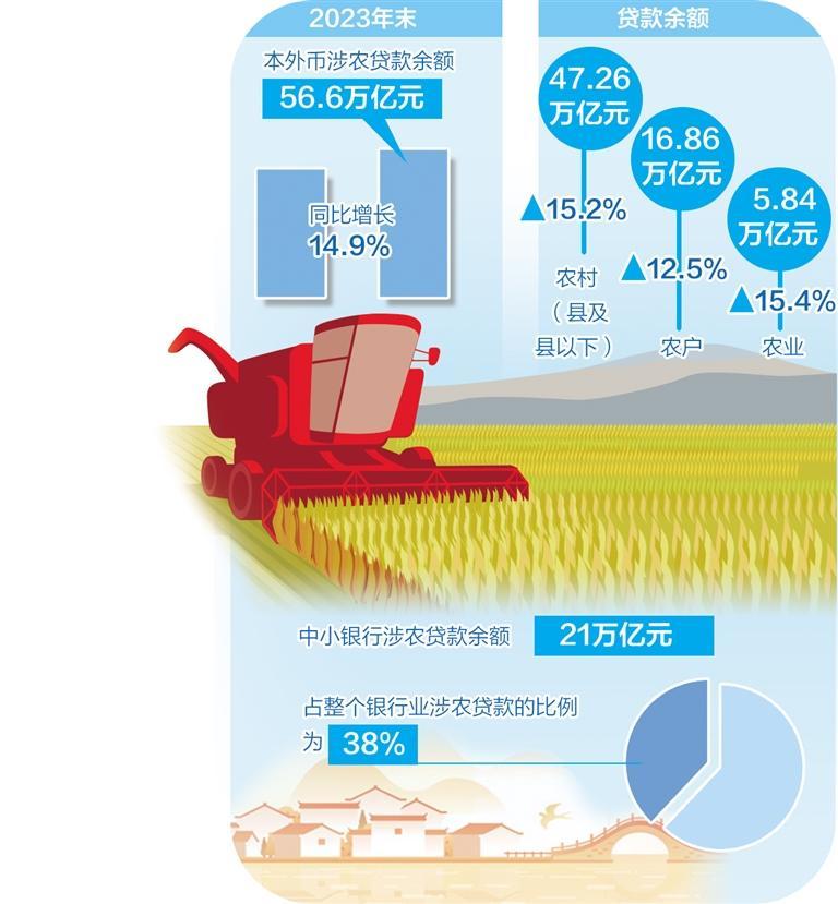 最近,中国人民银行发布《2023年金融机构贷款投向统计报告》。报告显示,2023年末,本外币涉农贷款余额56.6万亿元,同比增长14.9%。